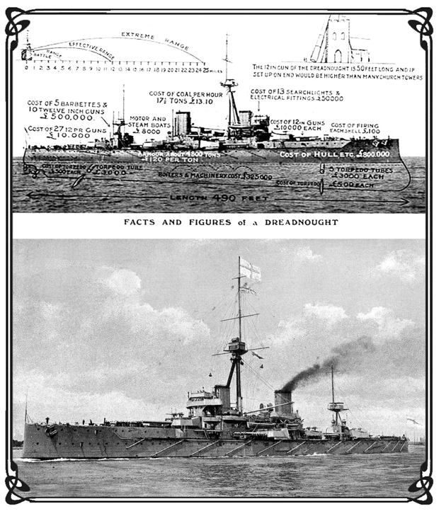Ramsgate pulled closed the thick curtain and then lit the lamp on a magic lantern. The sleek image of a battleship was projected. Though the ship was barely completed, the silhouette—with its long snout and myriad big gun turrets—was already world-famous. Mycroft began to speak. “The Dreadnought, the ultimate battleship! With the firepower of any two ships afloat, she’ll make Germany’s entire naval programme obsolete.”
