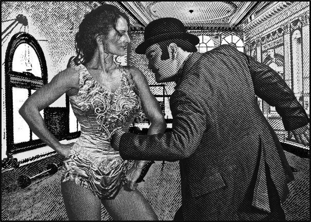 The smaller man, clean-shaven and neatly dressed in working clothes, glanced around to make certain no one was paying attention. Then he produced a small velvet case from his pocket. The second man, heavy-set, with a goatee, placed a jeweller’s glass to his eye, stroked his beard and examined the merchandise from inside the case—a diamond necklace. He replaced the glass in his pocket. Then, scowling, he took a water glass and used it to smash the “diamond” into fragments. The smaller man babbled in speechless amazement. Before either of them could act, a shadow crossed the table. They both looked up to see Mother, dressed as a belly-dancer, holding a small Webley revolver in one hand, while in the other twirling the real diamond necklace.