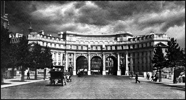 The commander was enjoying his walk and could see the scaffolding set up for the construction of the massive Admiralty Arch just bordering St. James. The officer smiled in satisfaction. Aston Webb’s elegant design would contain two residences for the Sea Lords, but more importantly, greatly expanded office space that the new, twentieth century Royal Navy desperately needed, even with the addition of its newly completed Queen Anne-style extension now called “The Old Admiralty Building.” The new First Sea Lord’s reforms were shrinking the fleet while at the same time doubling the staff work. The palatial building, with its three distinctive arches, would be an impressive sight when completed. As if the monumental architecture weren’t enough to remind everyone of the importance the navy played in Britannia’s life, the Admiralty Arch would also form part of the ceremonial approach to Buckingham Palace. The commander noted with pride that Aston Webb had also designed the front of the royal residence.