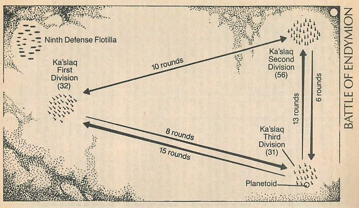 Although reports suggest Thule as a likely target for the Ka’slaq fleet, Ulnar has to take other factors into account. The capture of one of five ships at S.C. 170 suggests the possibility, at least, that the aliens have access to the computer records that ship carried. If so, Endymion’s prominence as an exploratory base—and the point of origin of the human expedition—makes it a much more likely military target than Thule. At any rate, Endymion offers a better position for covering other vital worlds in the region than most of the other possible destinations.