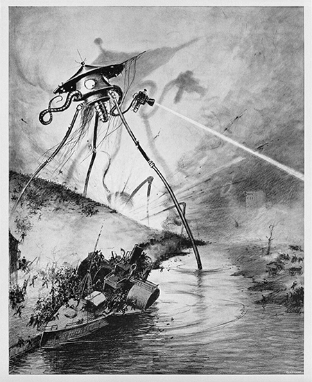 At sight of these strange, swift, and terrible creatures, the crowd along the water’s edge seemed to me to be for a moment horror-struck. There was no screaming or shouting, but a silence. Then a hoarse murmur and a movement of feet—a splashing from the water. A man, too frightened to drop the portmanteau he carried on his shoulder, swung round and sent me staggering with a blow from the corner of his burden. A woman thrust at me with her hand and rushed past me. I turned, too, with the rush of the people, but I was not too terrified for thought. The terrible Heat-Ray was in my mind. To get under water! That was it!