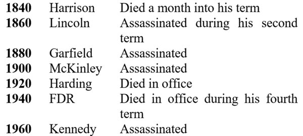 There has been talk of a twenty-year curse on the presidency. Almost everyone has heard that whoever is elected in a year that ends in a zero is doomed to an early death. The first presidents elected on the zero had no problems. Thomas Jefferson lived nineteen more years after leaving office and James Monroe another six years. The pattern seemed to have been broken by Franklin Roosevelt, who made it to his next term, being elected for a fourth time in 1944. But then he did die while still in office. Here are the fates of the presidents elected on the twenty-year periods from 1840 to 1960. Fortunately, Ronald Reagan seems to have broken the pattern for good, having been elected in 1980 and lived on many years after his presidency.
