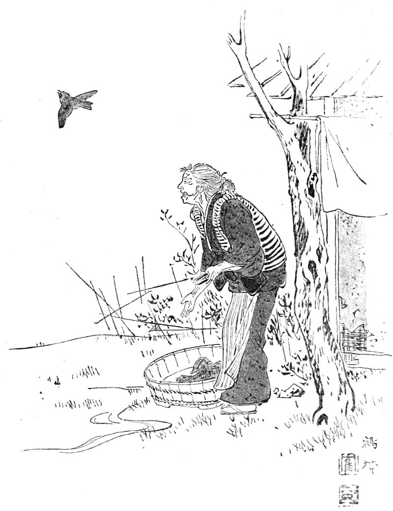 “What a dreadful misfortune for my poor Suzume San to lose her tongue!” he said to himself. “She won’t be able to chirp any more, and surely the pain of the cutting of it out in that rough way must have made her ill! Is there nothing to be done?”