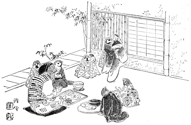 Then the Lady Sparrow, as we will now call her, introduced all her family to the old man. This done, her daughters, robed in dainty crape gowns, brought in on beautiful old-fashioned trays a feast of all kinds of delicious foods, till the old man began to think he must be dreaming. In the middle of the dinner some of the sparrow’s daughters performed a wonderful dance, called the “Suzume-odori” or the “Sparrow’s dance,” to amuse the guest.