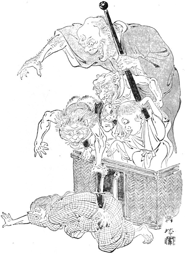 At last this greedy and selfish old woman put down the box by the wayside and opened it carefully, expecting to gloat her eyes on a mine of wealth. What she saw, however, so terrified her that she nearly lost her senses. As soon as she lifted the lid, a number of horrible and frightful looking demons bounced out of the box and surrounded her as if they intended to kill her. Not even in nightmares had she ever seen such horrible creatures as her much-coveted box contained. A demon with one huge eye right in the middle of its forehead came and glared at her, monsters with gaping mouths looked as if they would devour her, a huge snake coiled and hissed about her, and a big frog hopped and croaked towards her.