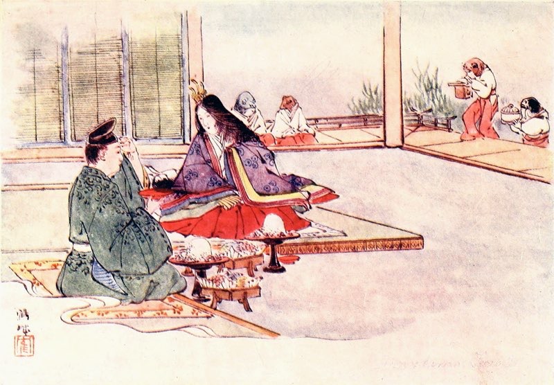 Urashima, being only a poor fisher lad, did not know how to behave in a palace; but, strange though it all was to him, he did not feel ashamed or embarrassed, but followed his kind guides quite calmly where they led to the inner palace. When he reached the portals a beautiful Princess with her attendant maidens came out to welcome him. She was more beautiful than any human being, and was robed in flowing garments of red and soft green like the under side of a wave, and golden threads glimmered through the folds of her gown. Her lovely black hair streamed over her shoulders in the fashion of a king’s daughter many hundreds of years ago, and when she spoke her voice sounded like music over the water. Urashima was lost in wonder while he looked upon her, and he could not speak. Then he remembered that he ought to bow, but before he could make a low obeisance the Princess took him by the hand and led him to a beautiful hall, and to the seat of honour at the upper end, and bade him be seated.