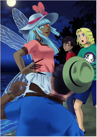 She looked young, barely in her teens. Long, white-blond hair was neatly cut around a pretty, innocent, childlike face, and she was dressed in a dark pink top with short sleeves and a white wrap skirt with a bow in the back. On her head was a large white hat with a pink ribbon, a big flamingo feather and a wide brim, and she wore a jeweled choker around her neck. Her eyes were huge and wide-set; one red, the other gold, and four beating wings kept her feet from touching the ground. The girl turned in place, a hovering dragonfly, and looked in their direction.