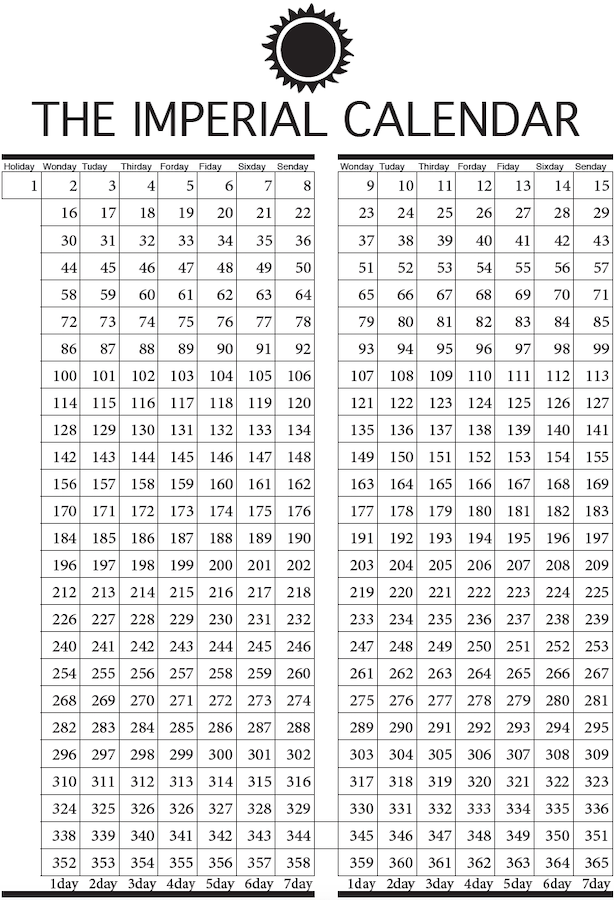 The Imperial Calendar numbers the days of each year from 1 to 365 (matching both the Sylean and the Terran standard calendar years). Imperial holidays and important dates are marked; additional holidays may be added by local authorities.
