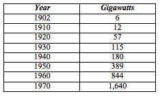 Increasingly enormous quantities of electrical power were demanded by residences, businesses, and all sectors of industry. The need for massive central power stations led to damming great rivers, and building numerous and increasingly large fossil fuel power plants. (22) The selection of sites for new industrial facilities, including the locations of Oak Ridge and Hanford by the Manhattan Project during World War II, were based on access to electrical generation capacity. The total quantity of electrical power generated in the United States in 1902 (the first date of reliable statistics) was about 6 gigawatts. Look at how production grew: