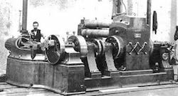 To get a sense of the effect that electric motors had on industrial operations, one need only compare large scale pre-electric manufacturing with the electrified conditions that replaced them. The earlier method was to have a large steam engine whose main shaft was connected to several other shafts that traversed the ceiling above the working floor. These secondary shafts would have a great many pulleys mounted on them, each driving a belt dropping to an individual machine on the working floor. The result was a loud, congested, and dangerous working environment. Here’s a video that gives a glimpse of the old, belt-driven process.