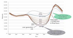 Grid planners at the California Independent System Operator (CAISO) noted in 2013 a looming challenge. Using both historical and projected load data, they calculated the daily total electricity demand and subtracted from it the power produced by renewable generation (mostly solar). What they found was that renewable generation would rapidly push conventional generation off-line as the sun rose. Then, as the sun set, the need for that same conventional generation would return even more quickly, rising as much as 13,000 MW in three hours. The effect was made even more severe because the peak total demand period was during and after sunset.