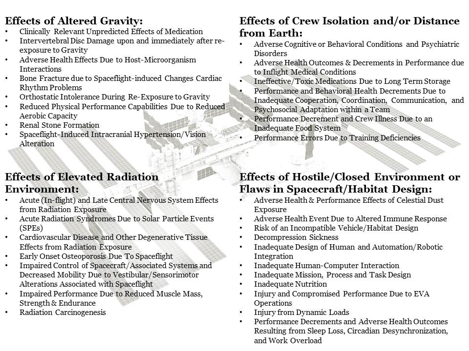 Before any consideration of whether to adapt humans to new environments or adapt those environments to better suit humans, we need to examine just what the conditions, and particularly the hazards, are that would require adaptation. NASA's Human Research Roadmap currently identifies 33 identified risks—"Risks include physiological and performance effects from hazards such as radiation, altered gravity, and hostile environments, as well as unique challenges in medical support, human factors, and behavioral health support"—and 317 gaps in current scientific knowledge—"Gaps represent the critical questions that need to be answered to mitigate a risk and therefore serve to focus the areas of research work to address risk reduction milestones."