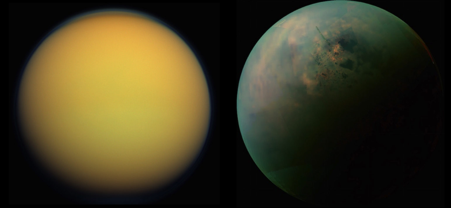Saturn’s largest moon, Titan, may be the coolest object in the solar system. It has been slowly unveiled, first by Pioneer 11 and later by Voyagers 1 and 2 and Cassini. Cassini returned one of the most haunting images I’ve ever seen: the narrow crescent of Titan, tinted orange with photochemical haze, almost obscuring the glint of sunlight off an alien sea.