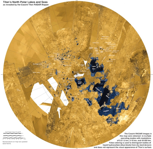 RADAR image of Titan’s north pole from Cassini. The largest sea, Kraken Mare, is larger than Lake Superior. Credit: International Astronomical Union Working Group for Planetary System Nomenclature. "Gazetteer of Planetary Nomenclature." 2018 March 18. |